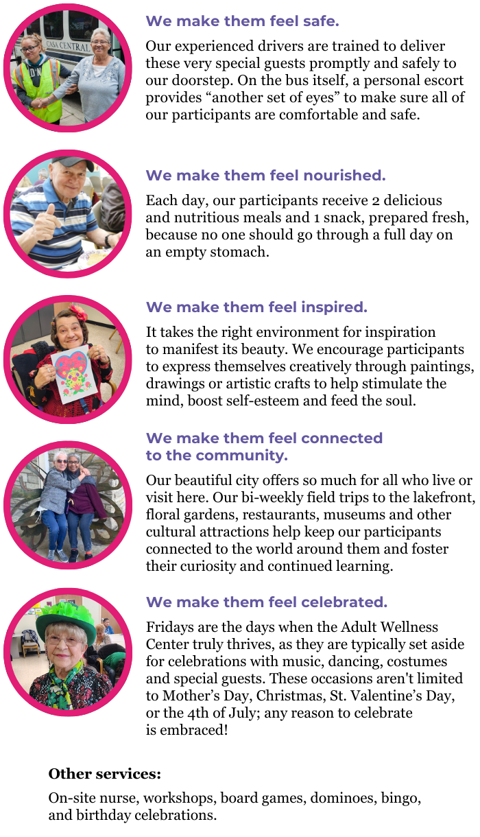 If you are seeking information regarding programs for older adults, Casa Central does offer Home Care Services and the Adult Wellness Center, which is a day service. Contact Casa Central directly for more information at 773-645-2300.